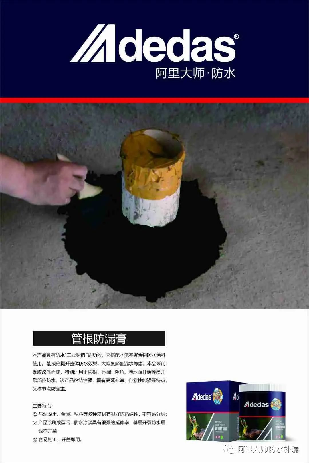(见图,四周黑色部分为阿里大师管根防漏膏)