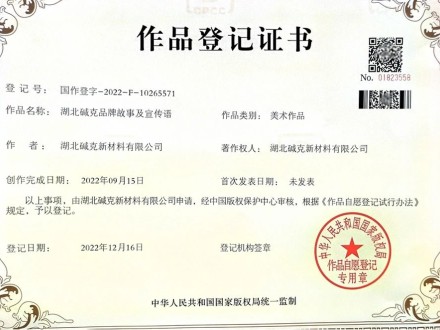 - 湖北碱克新材料有限公司获国家版权局著作权认证,向抄袭剽窃说NO!
