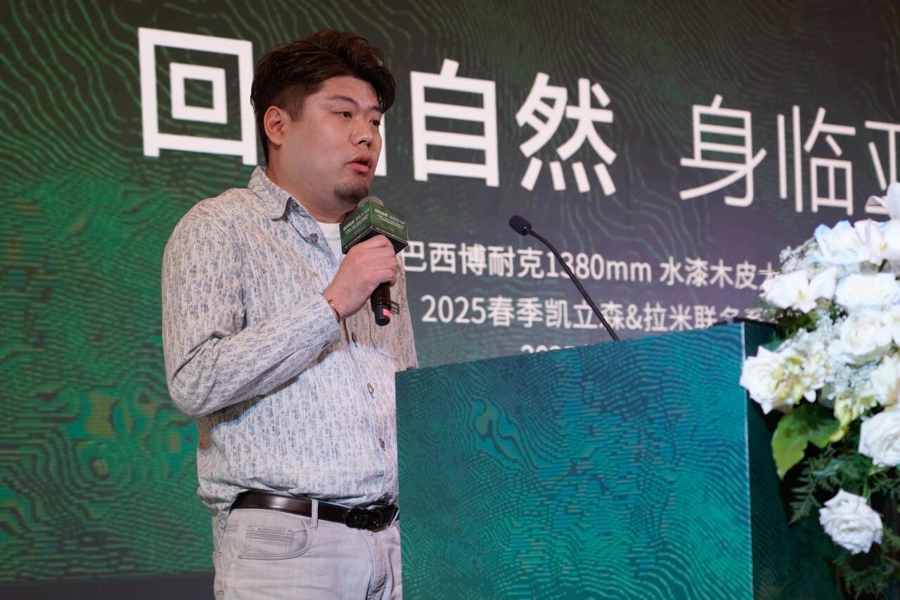 徐世东展示了拉米集团的生产流程、设计理念以及全球市场布局,并围绕拉米未来的三大家居趋势关键词“灵活、可持续与包容”详细阐述了三大可视性生活方式:小而精致的生活、有意义的情感生活和可持续的生活方式。他表示,年轻一代对“家”的全新理解——从物理空间转变为情感与情绪的寄托,未来的家居设计将遵循功能性与个性化并重,同时更加注重情感因素,通过色彩、几何图形等元素传递情绪价值。随后,他重点介绍了Karrisen凯立森®拉米联名的2025年春季系列产品,该系列共包含28款花色,涵盖了木纹、石纹、布纹及素色等多种选择,特别强调了榆木、洞石等纹理流行趋势及粗布纹的创新尝试。同时,他也展望了素色市场的潜力,尤其是鼠尾草绿等环保色彩的流行。
