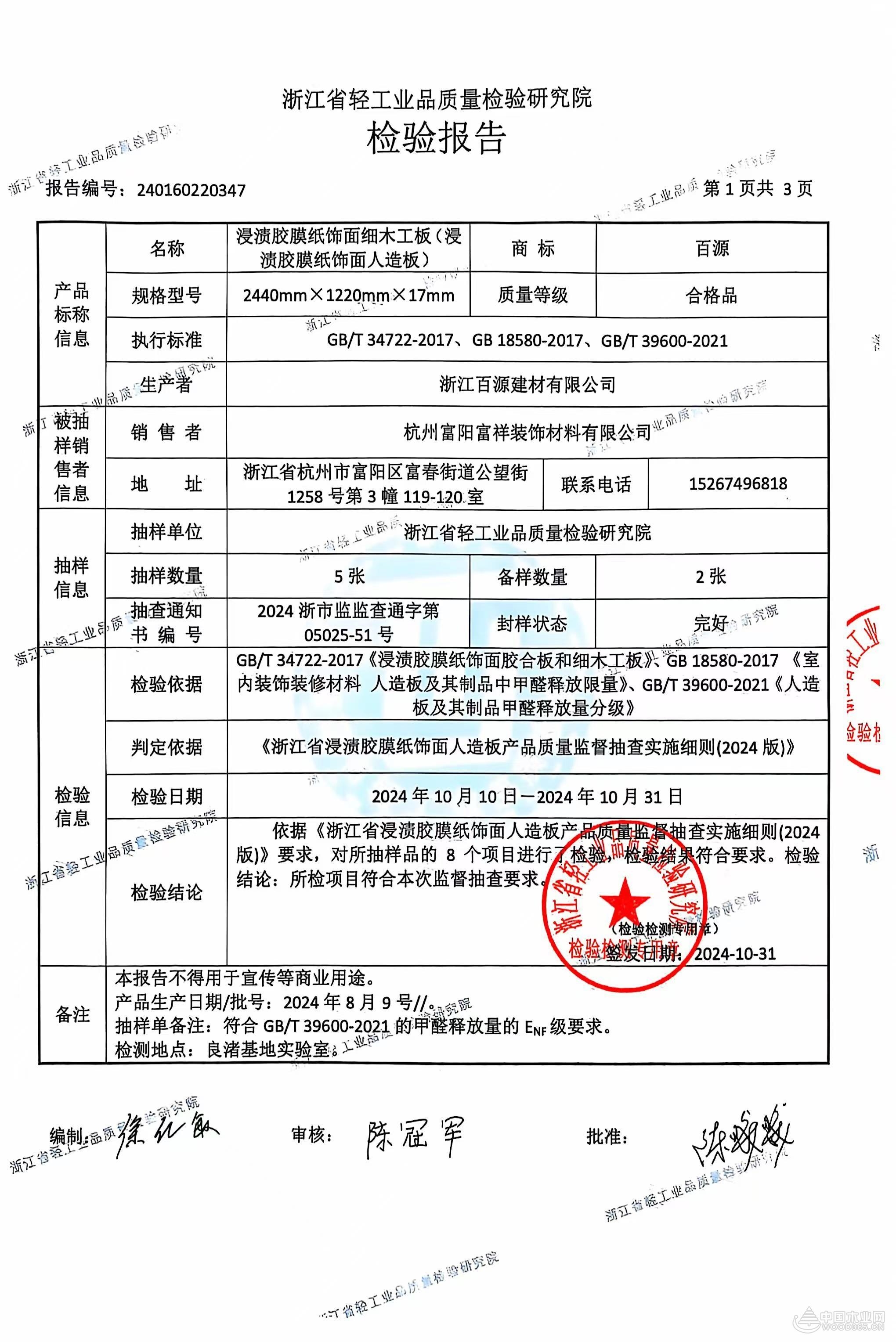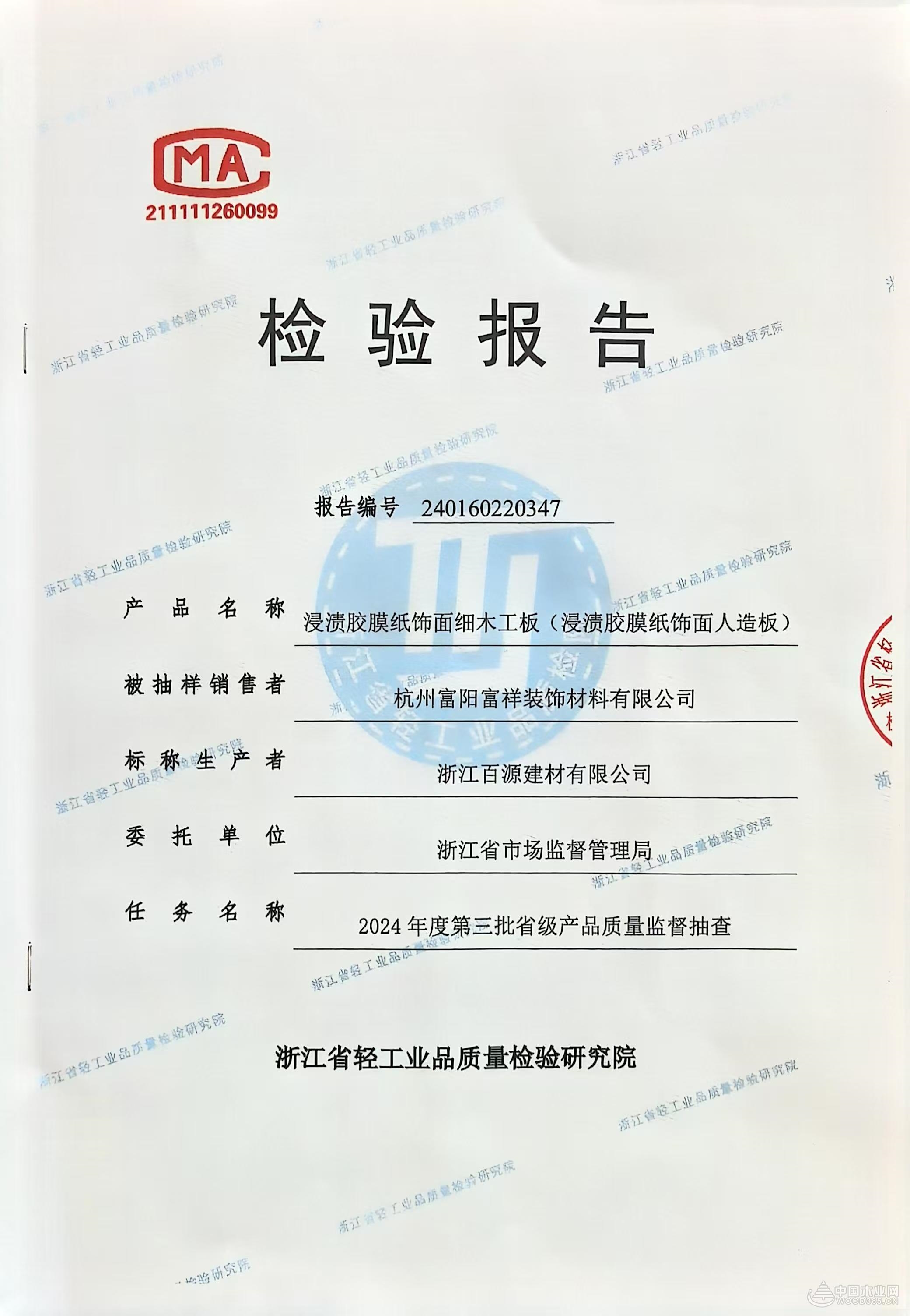 近日,在由浙江省市场监督管理局组织的2024年度第三批省级产品质量监督抽查中,浙江百源建材有限公司旗下产品浸渍胶膜纸饰面细木工板经检验指标全部合格,甲醛释放量优于国家最严标准ENF级,环保品质无可挑剔,深度守护家居安全!