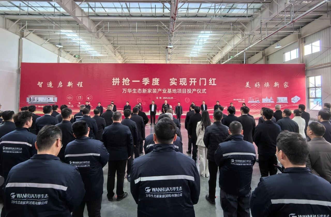 近年来,万华生态新家装持续探索和推动绿色工业化定制内装技术的创新与应用,专注于绿色建筑材料的研发、生产和销售,为旧局改翻新、地产精装房市场、工程装修等领域提供创新解决方案。此次正式投产的万华生态新家装信阳产业基地位于信阳市羊山新区,占地约141亩,总投资约 10 亿元,包含研发中心、生产厂房、专业测试区域、行政综合中心等功能区域,主要承担护墙板、浴室柜等经板材加工而成的成品,装配式整体卫浴以及拥有德国专利的吸音板成品等。一期投产后,可年产6万套整体卫浴和2万套新家装定制产品。