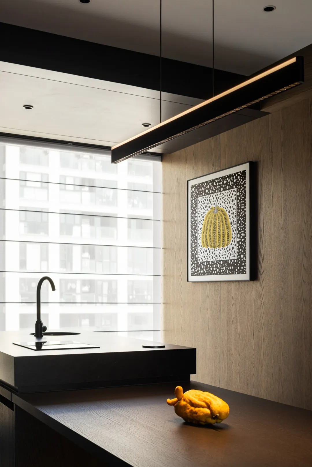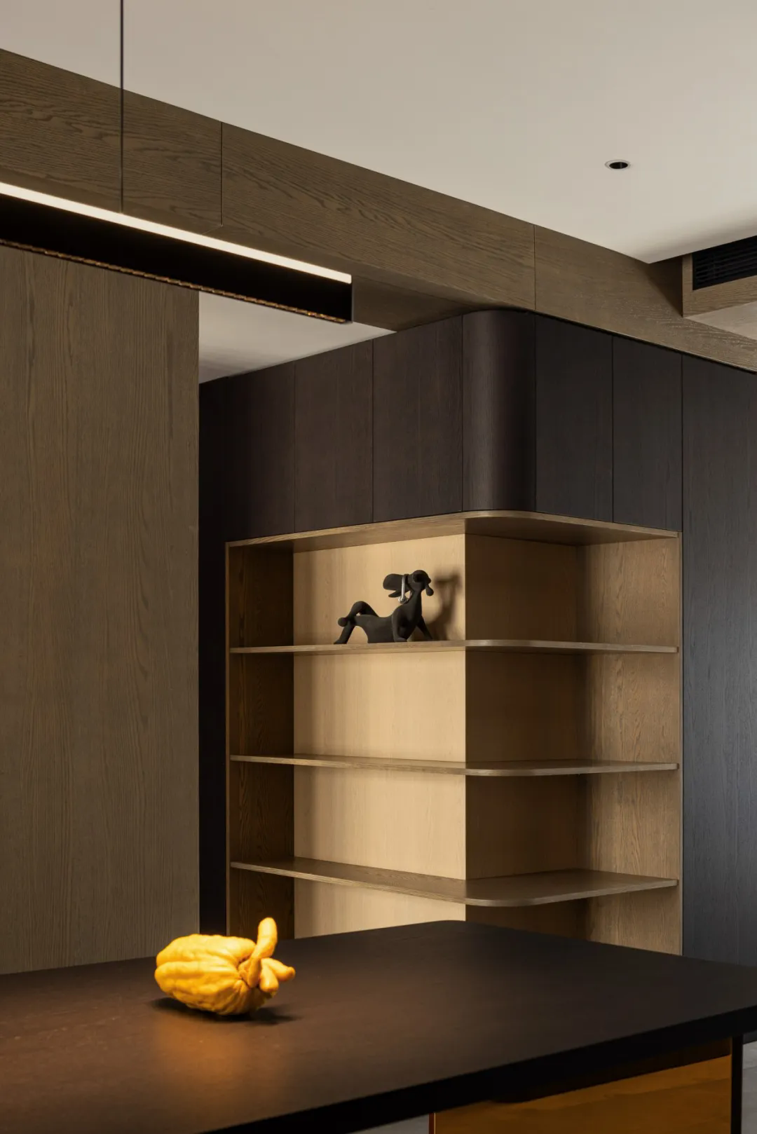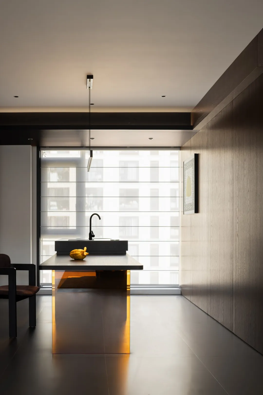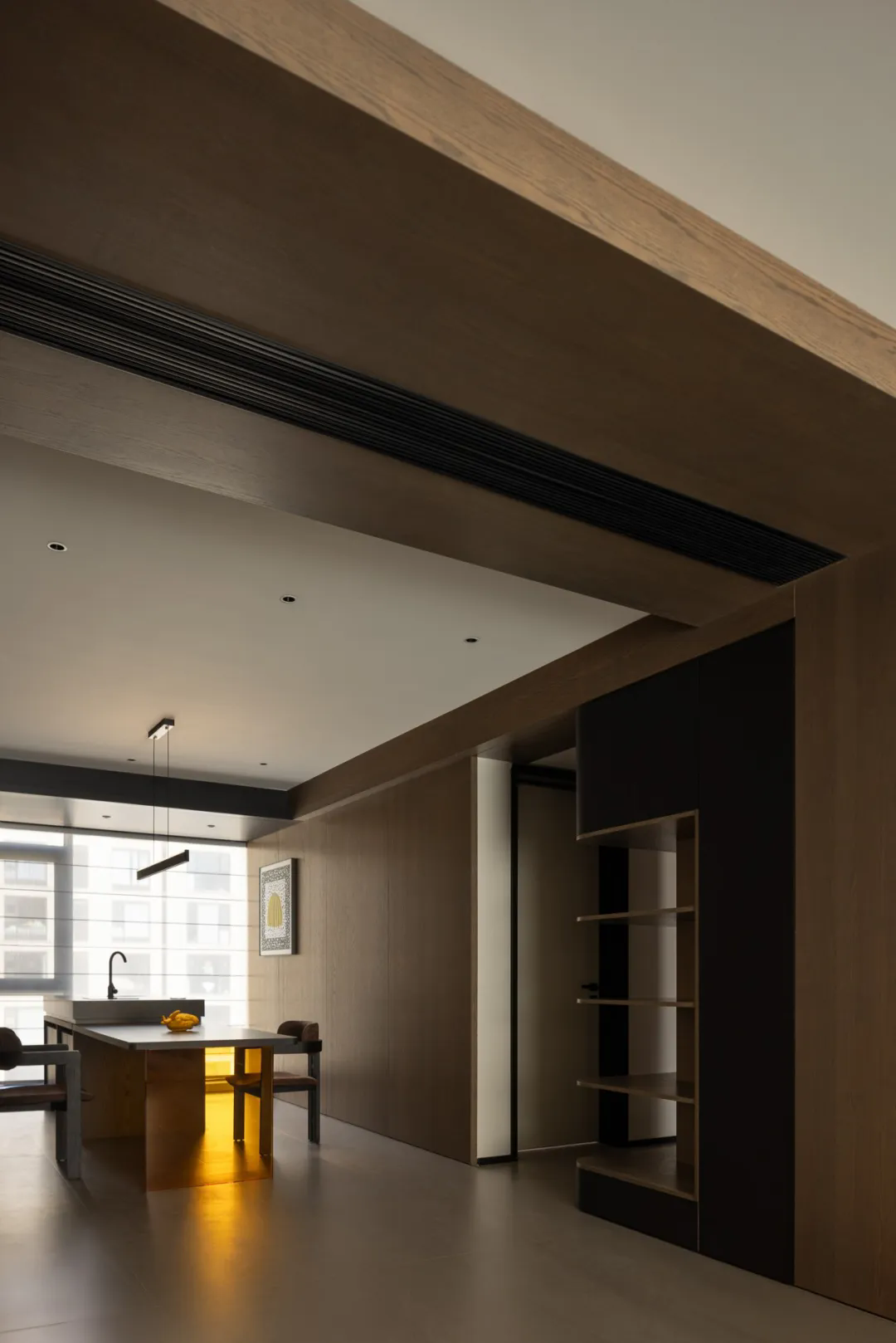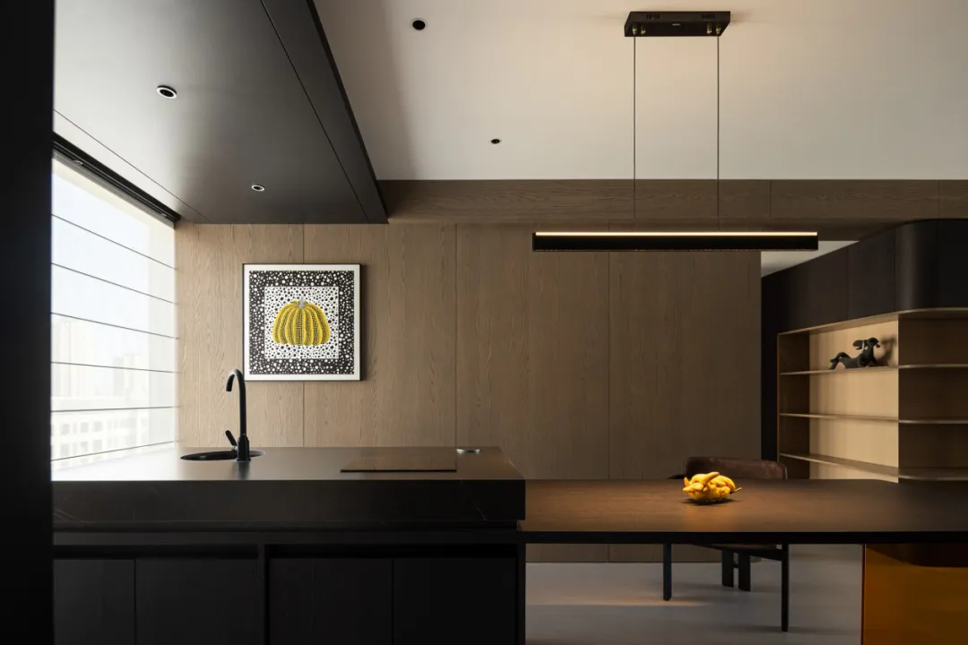 餐厅以木质家具为主,餐桌与岛台一体的设计是空间当之无愧的焦点,巧妙融合了实用性与艺术性,重塑了日常的生活场景。
