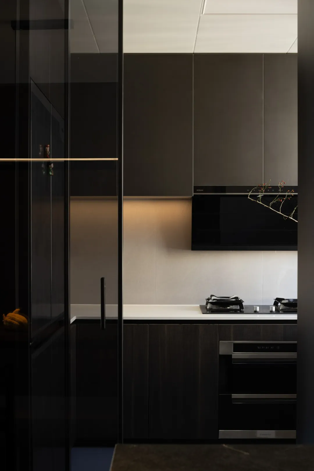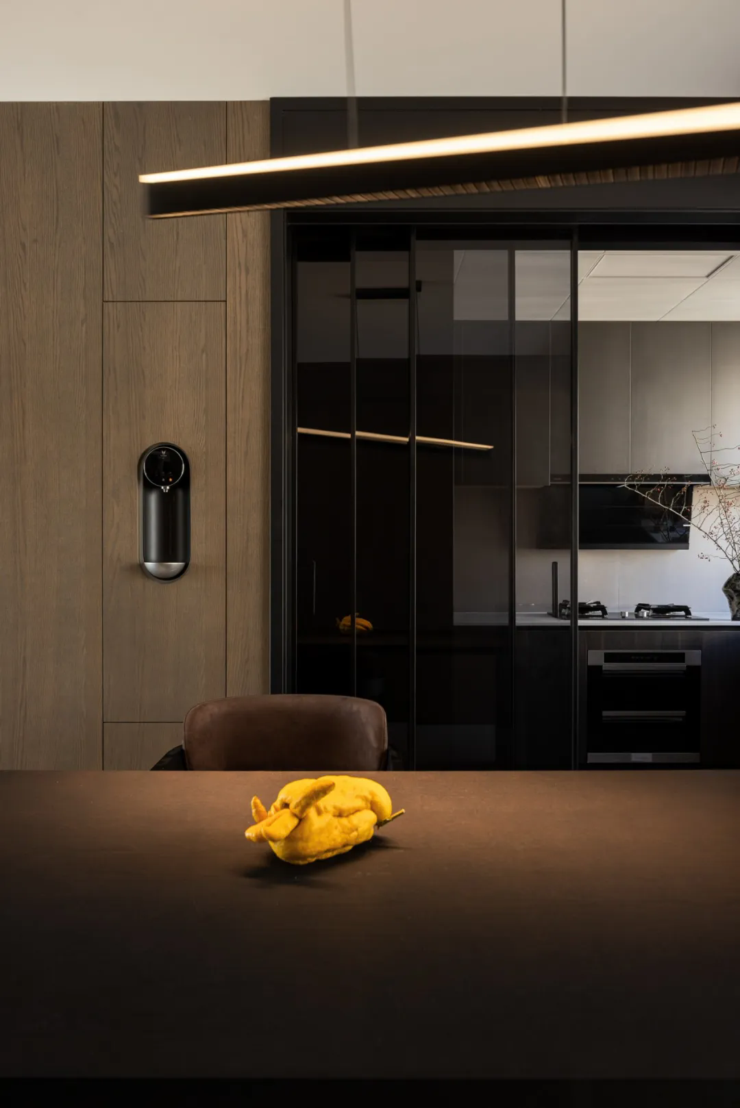 厨房与餐厅之间,精心设置了一扇极具现代感的推拉门,金属的冷峻光泽与玻璃的清透质感相互交融,相得益彰,也让厨房与餐厅的互动更加流畅自然,为家居生活带来更多便利与舒适。