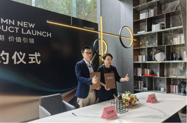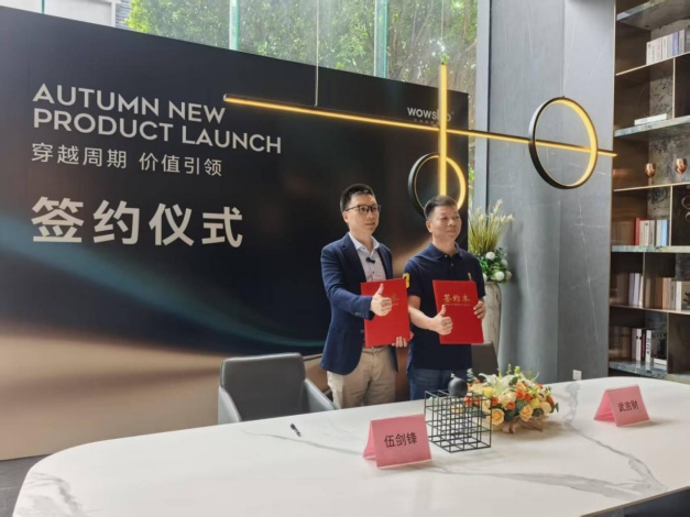本次发布会的两大签约仪式,成为华岩品致布局未来的重要见证。伍剑锋董事长先是与汤洁明总经理共同签署总部展厅扩容协议,他表示:“展厅扩容是品牌实力提升的直接体现,未来将为客户呈现更完整、更专业的岩板空间解决方案。”